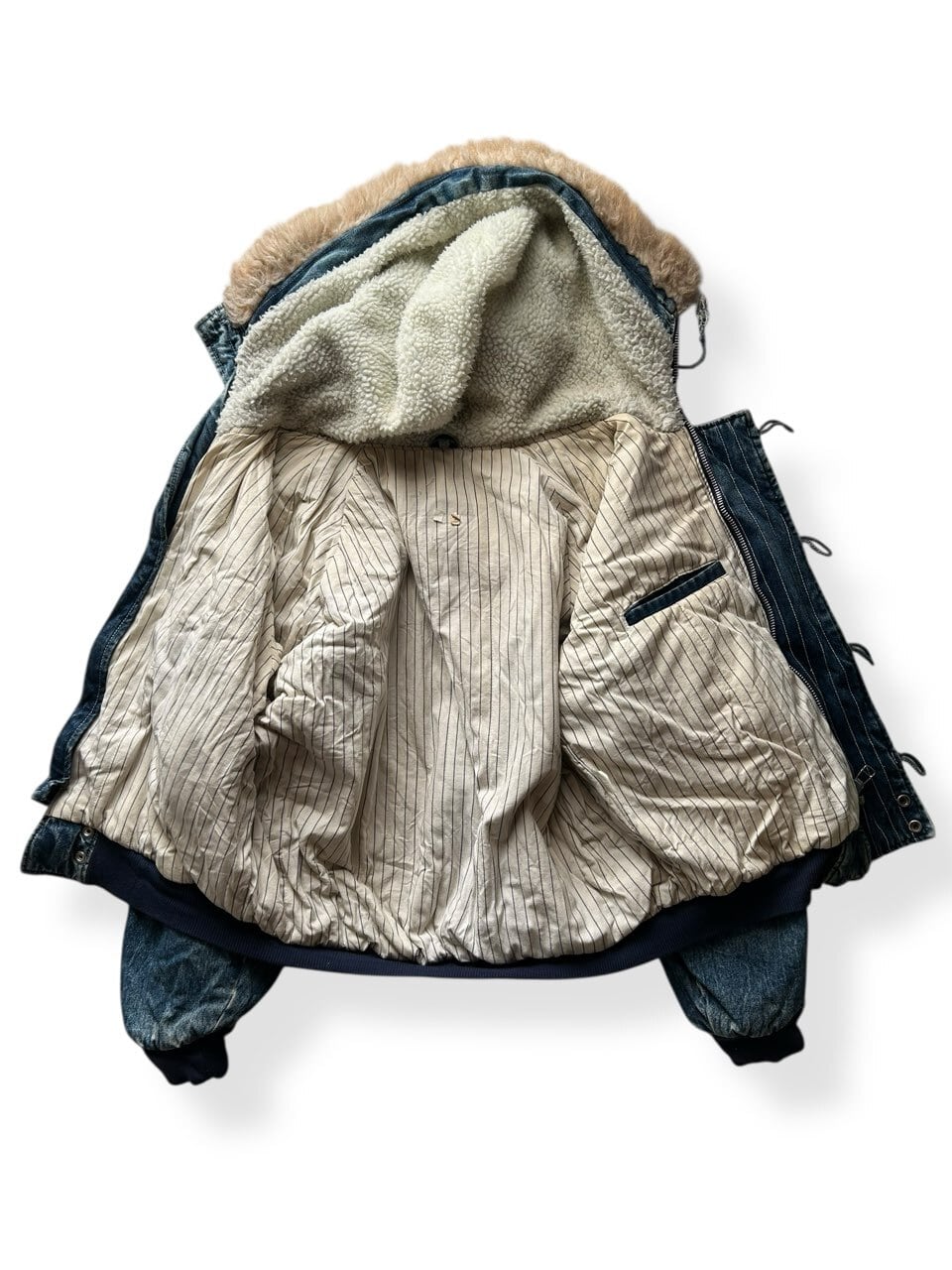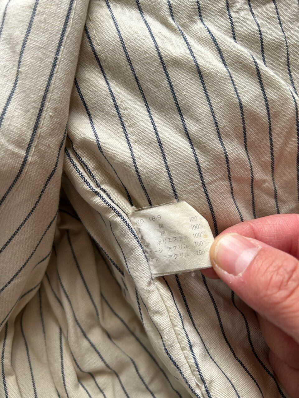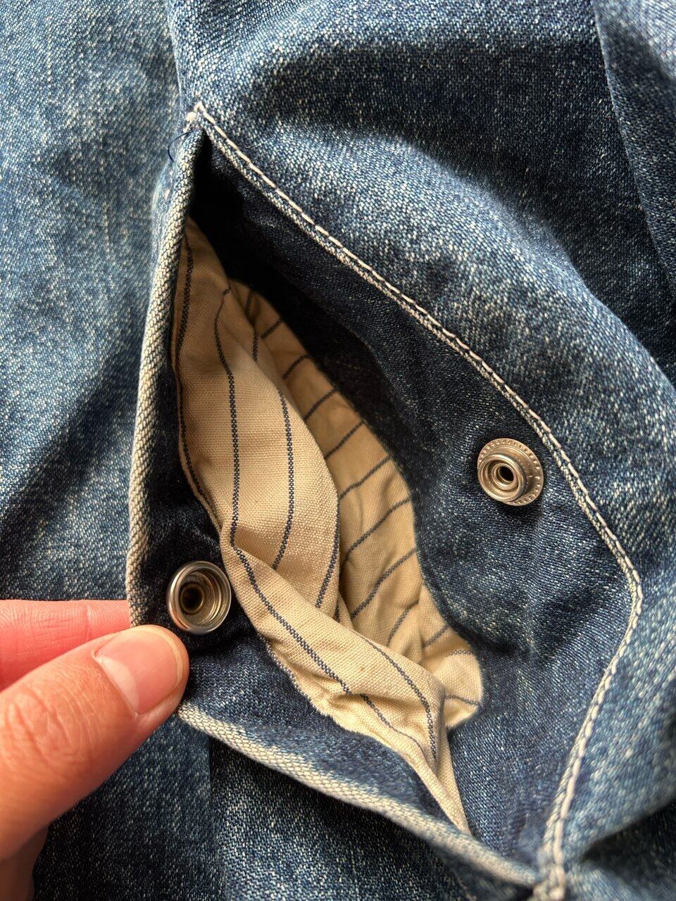 80'sのUSA製のラルフローレンのデニムのスウィングトップのような、ザラつきのある良い色味のインディゴで、裏地は中綿入りのコットンのストライプです。